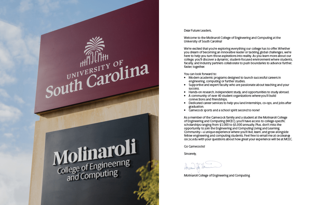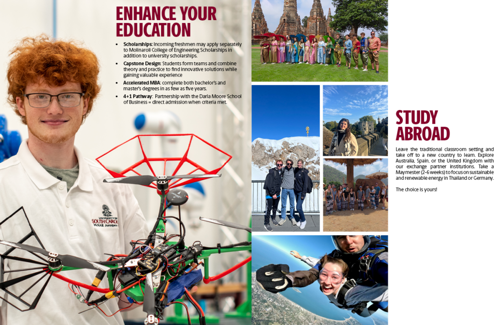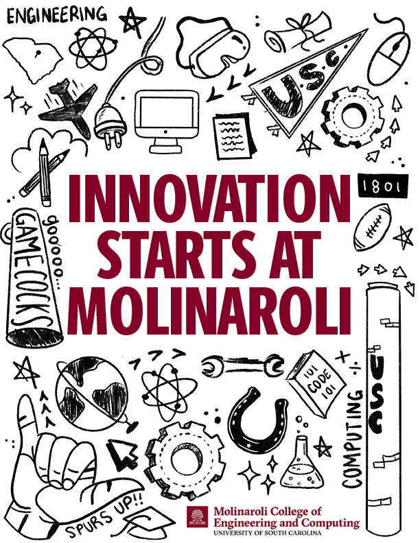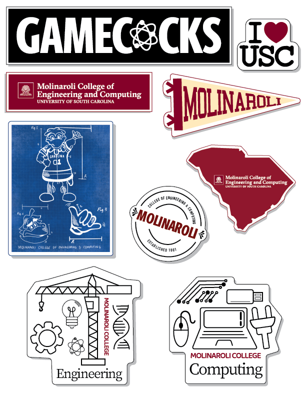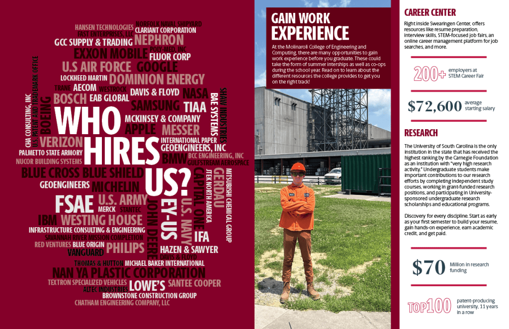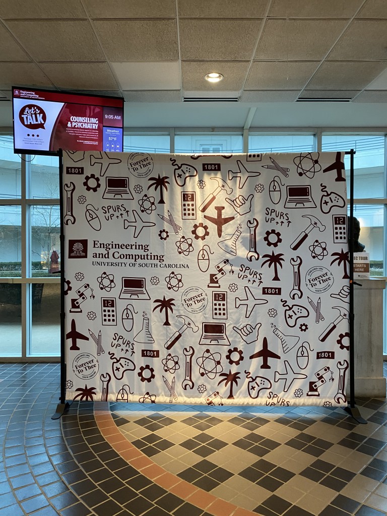 I have the pleasure of working for the University of South Carolina’s Molinaroli College of Engineering and Computing! Since January of 2024 I have been working as a Graphic Design Associate, designing a wide range of material for the College’s recruitment office. So far in this position I have created several posters, photo backdrops, stickers, and magazines. I have even started to work in the UX field on the college’s interactive TV. This job has taught me so much and I am so excited to share it with you!