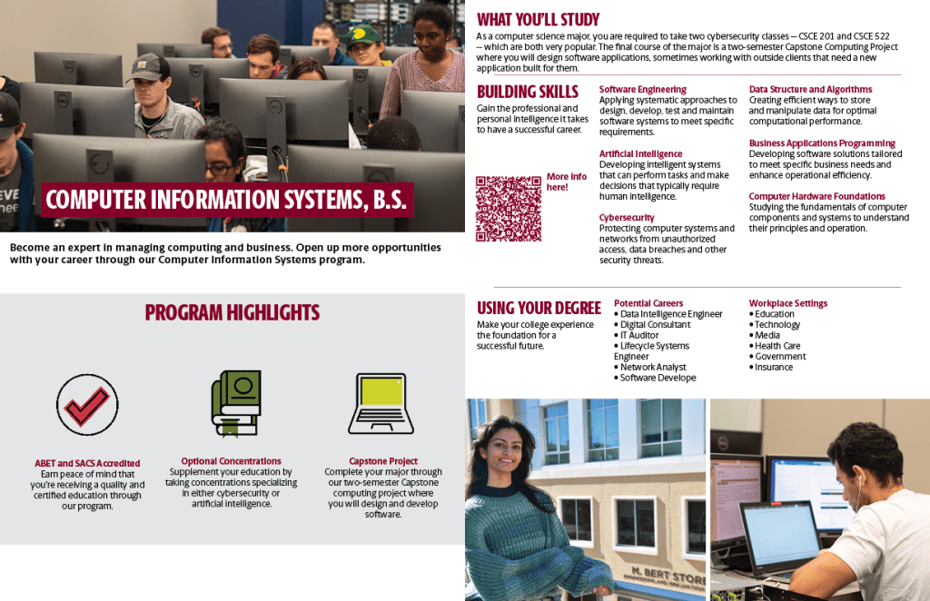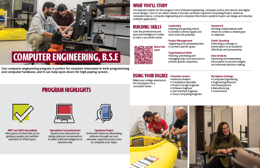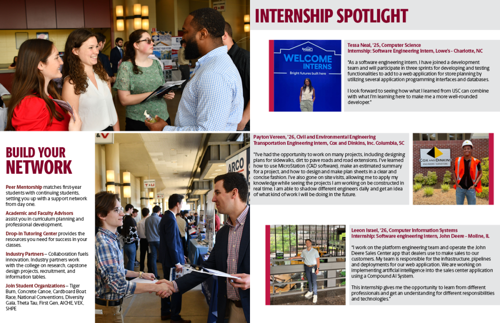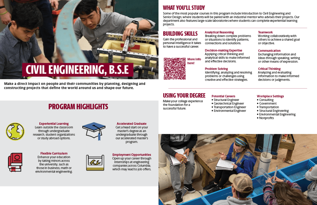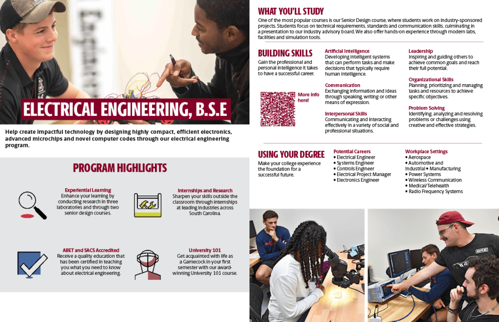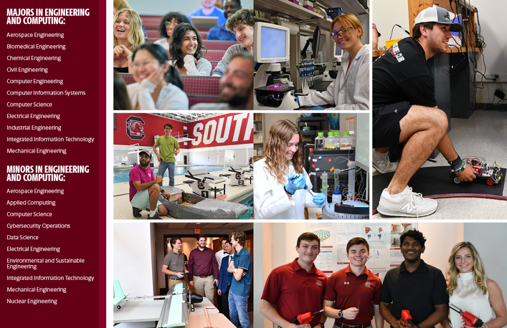 I have the pleasure of working for the University of South Carolina’s Molinaroli College of Engineering and Computing! Since January of 2024 I have been working as a Graphic Design Associate, designing a wide range of material for the College’s recruitment office. So far in this position I have created several posters, photo backdrops, stickers, and magazines. I have even started to work in the UX field on the college’s interactive TV. This job has taught me so much and I am so excited to share it with you!